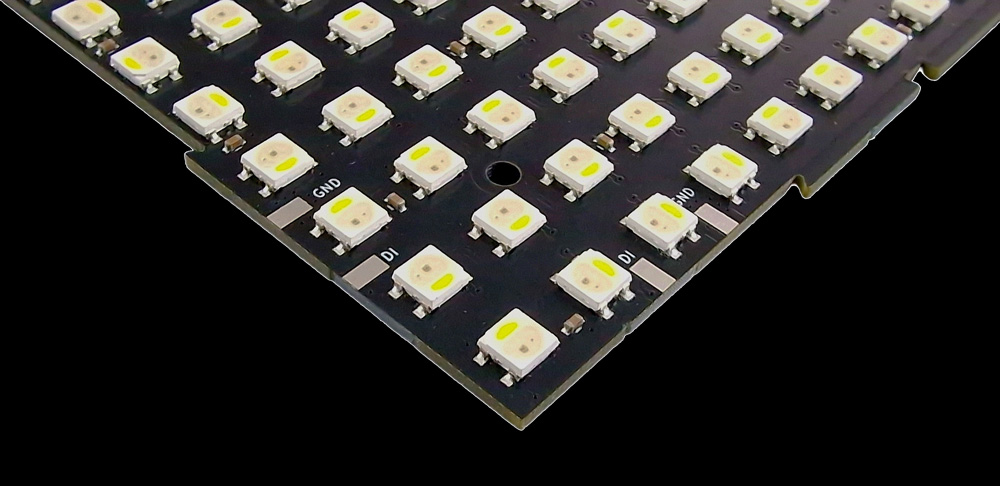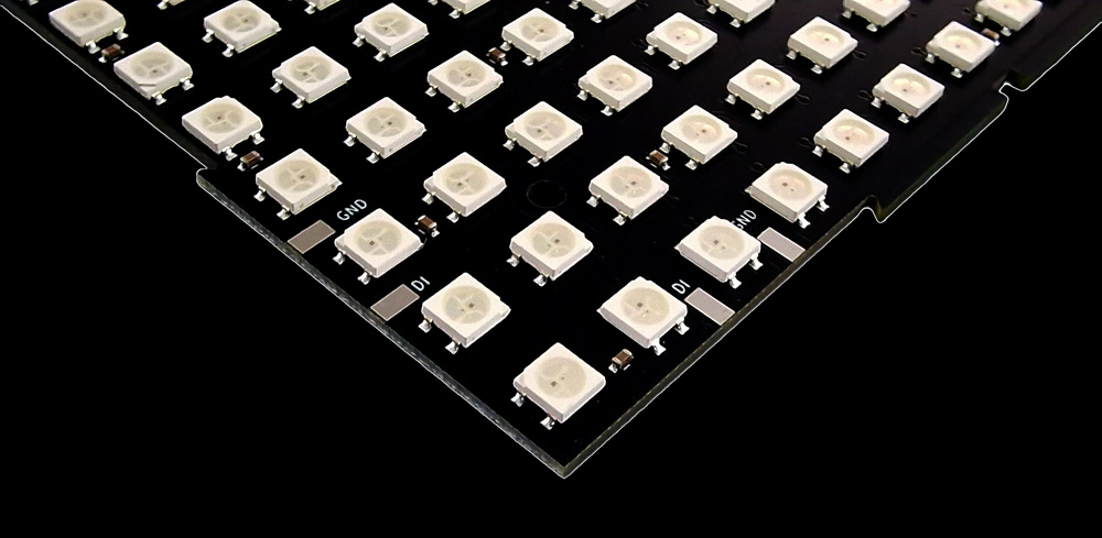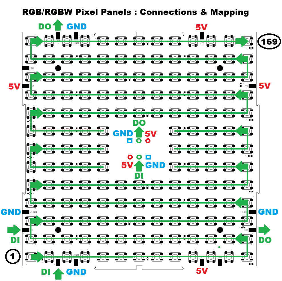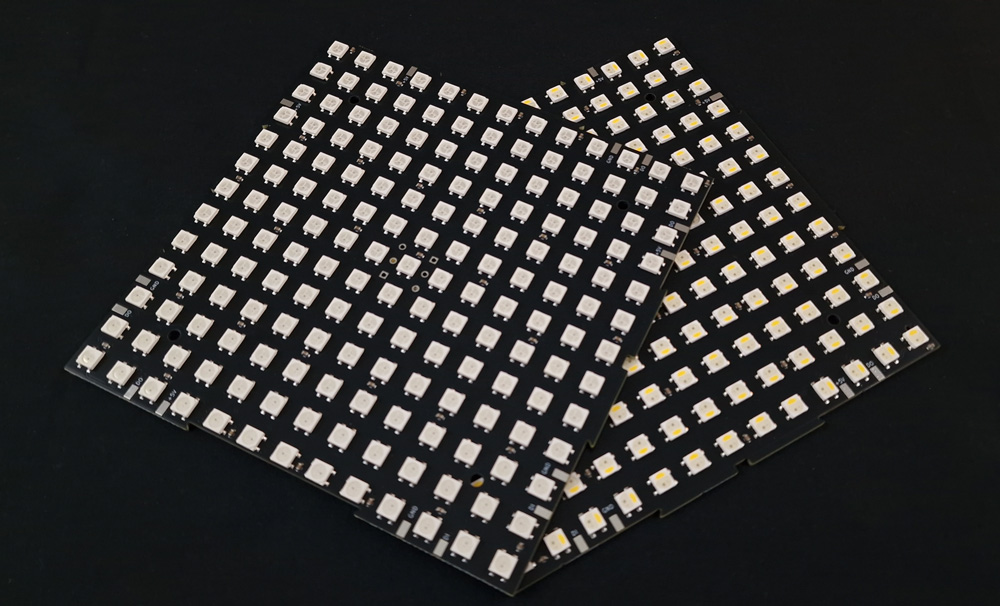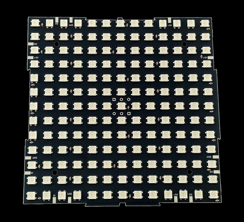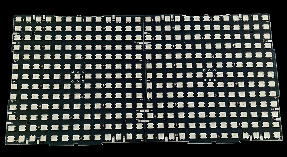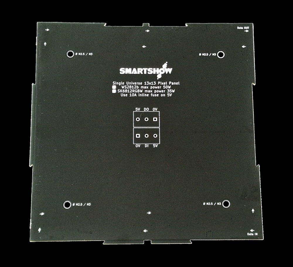 There is a reason why 169 pixels (13 x 13) was chosen for this design: firstly, to ensure that each matrix is square, and secondly, this number fits perfectly when driving these panels from an Art-Net or sACN source. With those protocols, we have 512 channels per universe available, and since we can’t get that number exactly from our channel count, we can get close: 169 pixels x 3 channels = 507 channels required per RGB Panel.