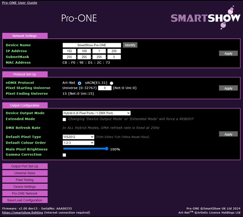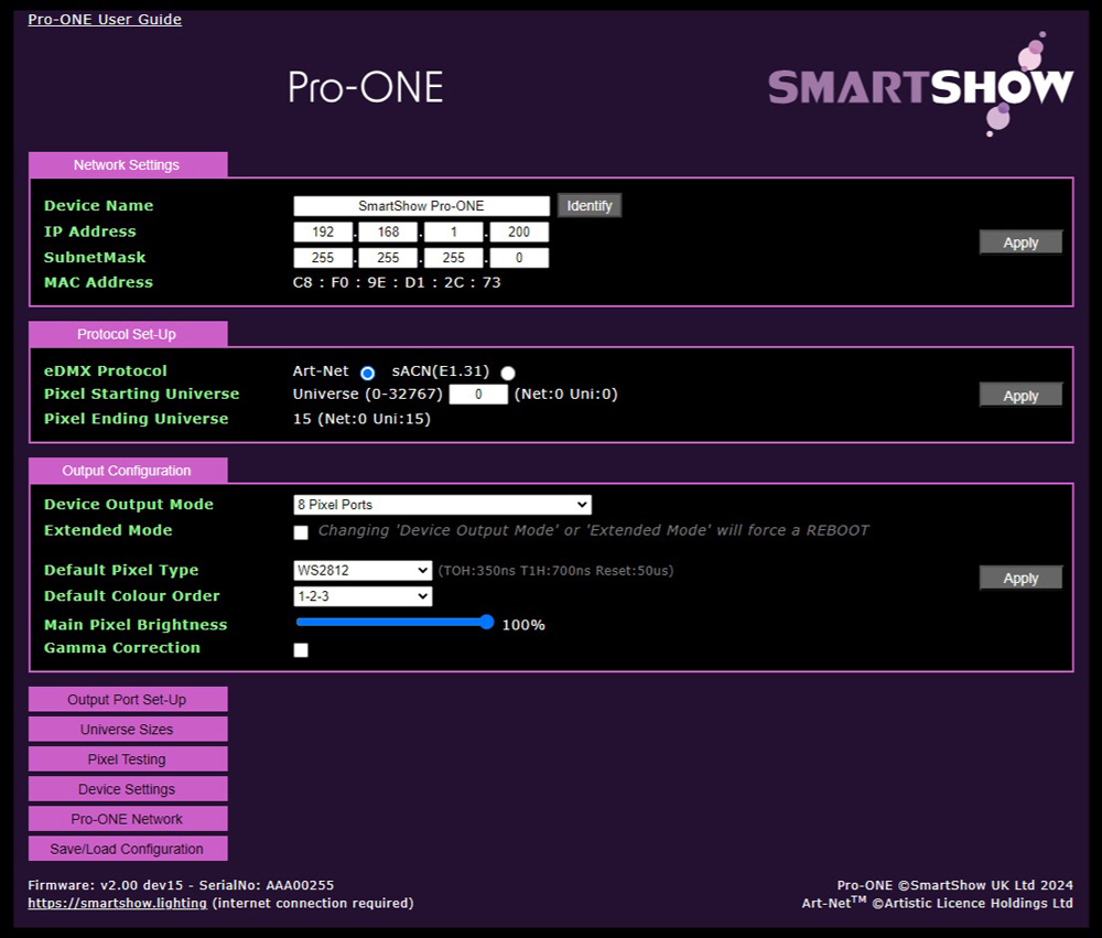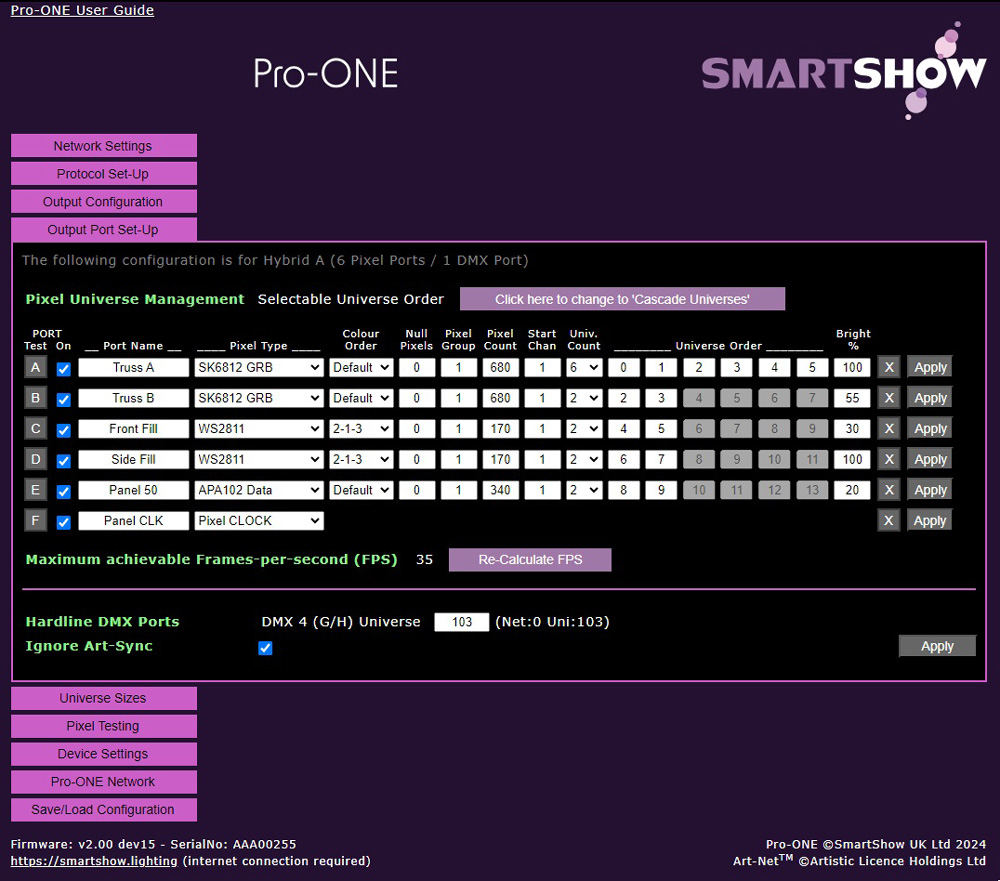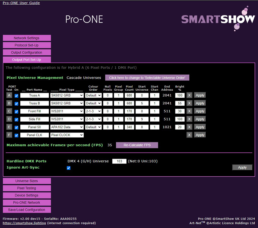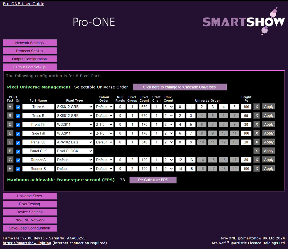 - Each Port can be individually customised within the webUI for Port Name, Pixel-Type, Colour-Order, Null, Pixels, Grouping, and Brightness