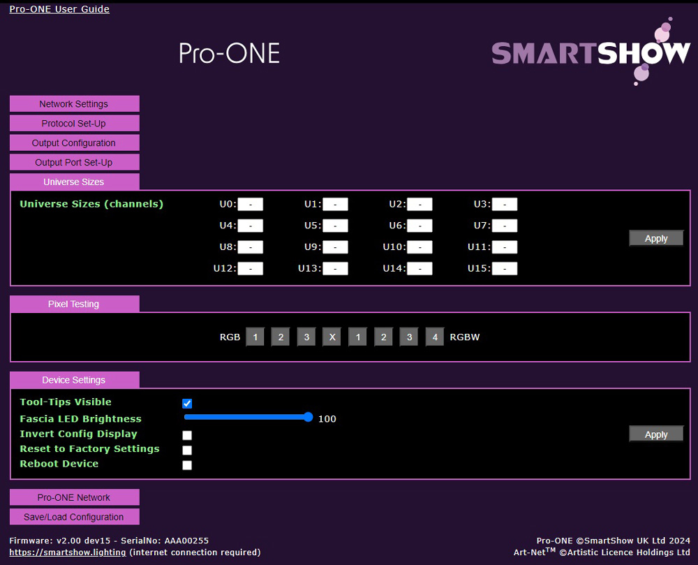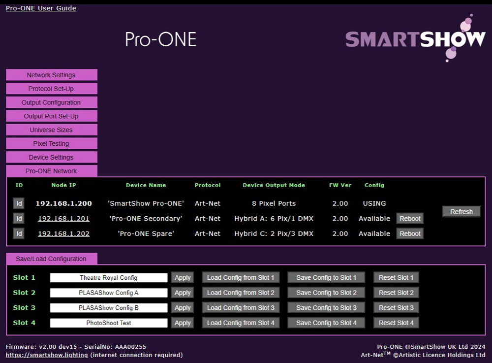- SmartShow ‘Pro-ONE Network’ information visible from WebUI (fw 2.0 onwards)
