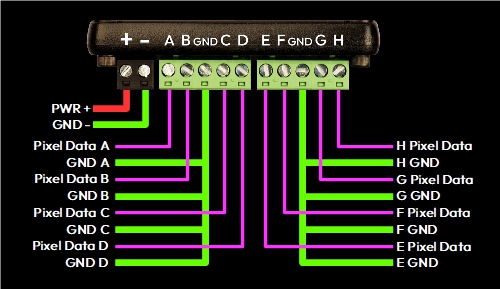 - Pixel Data: 2 x 5-way pluggable screw terminals